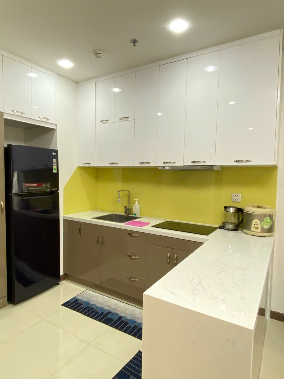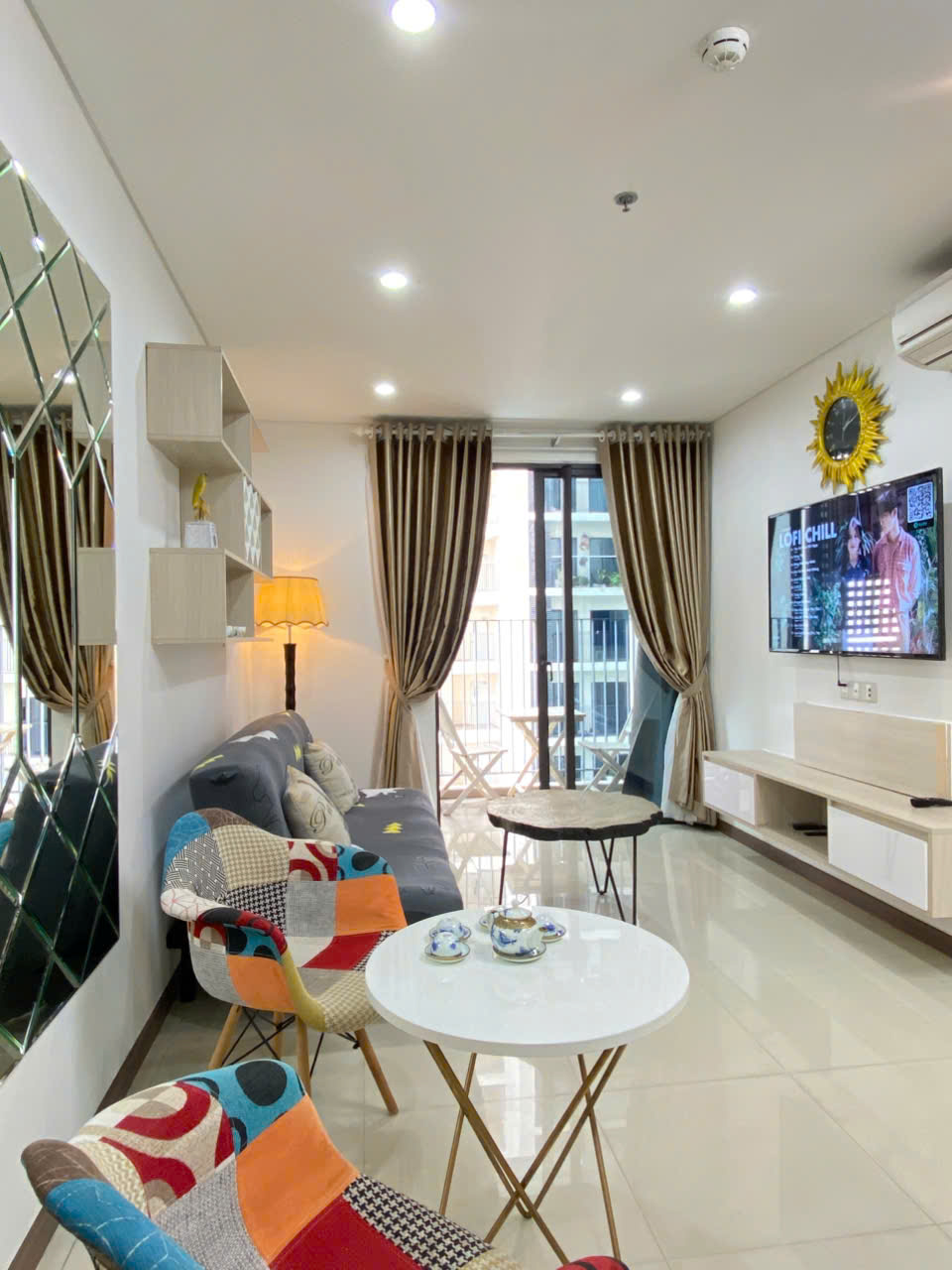 Nội thất cao cấp, sẵn sàng sử dụng Căn hộ được trang bị đầy đủ: TV thông minh, điều hòa tiết kiệm điện, lò vi sóng, bếp từ, và kính Low-E chống nhiệt. Tất cả mang lại trải nghiệm sống tiện nghi, hiện đại, phù hợp cho kỳ nghỉ ngắn hạn hoặc công tác.