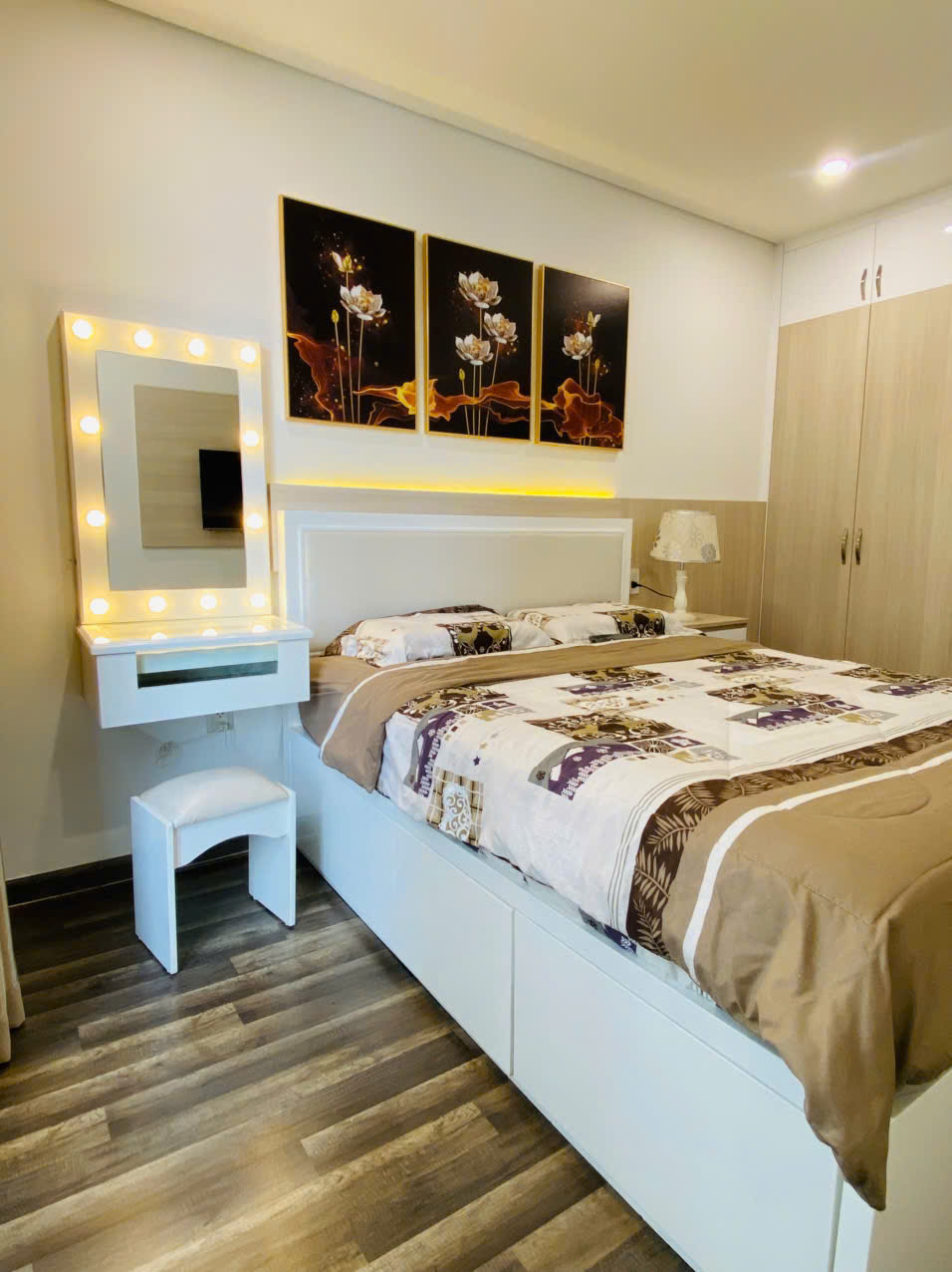 Thiết kế hiện đại, đầy đủ tiện nghi Căn hộ 1 phòng ngủ với 1 nhà vệ sinh, được trang bị nội thất cao cấp: giường êm ái, sofa, tủ âm tường, bếp từ, máy lạnh, TV thông minh, máy giặt, và Wi-Fi tốc độ cao. Không gian ấm cúng, hiện đại, đáp ứng mọi nhu cầu sinh hoạt, nghỉ dưỡng hoặc làm việc từ xa.