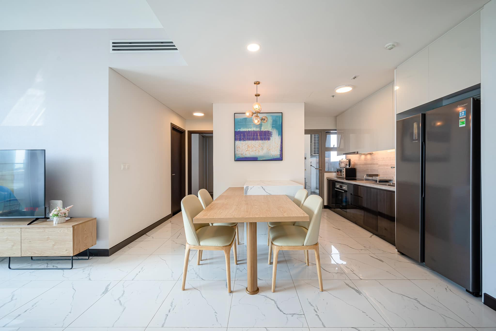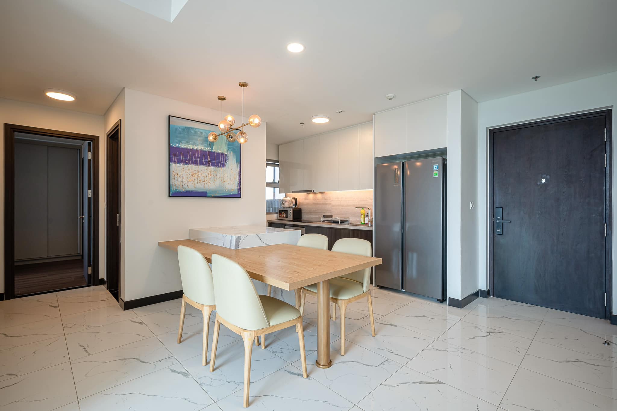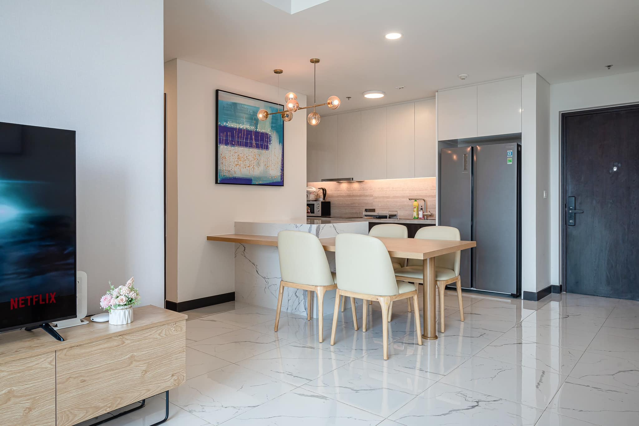Cho thuê căn hộ 2 phòng ngủ ngắn hạn Empire City tại CMU Apartment mang đến trải nghiệm sống tiện nghi, sang trọng. Căn hộ được vệ sinh kỹ lưỡng trước và sau mỗi lần thuê, sử dụng hóa chất thân thiện, đảm bảo không gian sạch sẽ, an toàn. Nội thất cao cấp, từ ga giường cotton mềm mại đến bếp đầy đủ dụng cụ, giúp bạn cảm nhận như ở nhà.