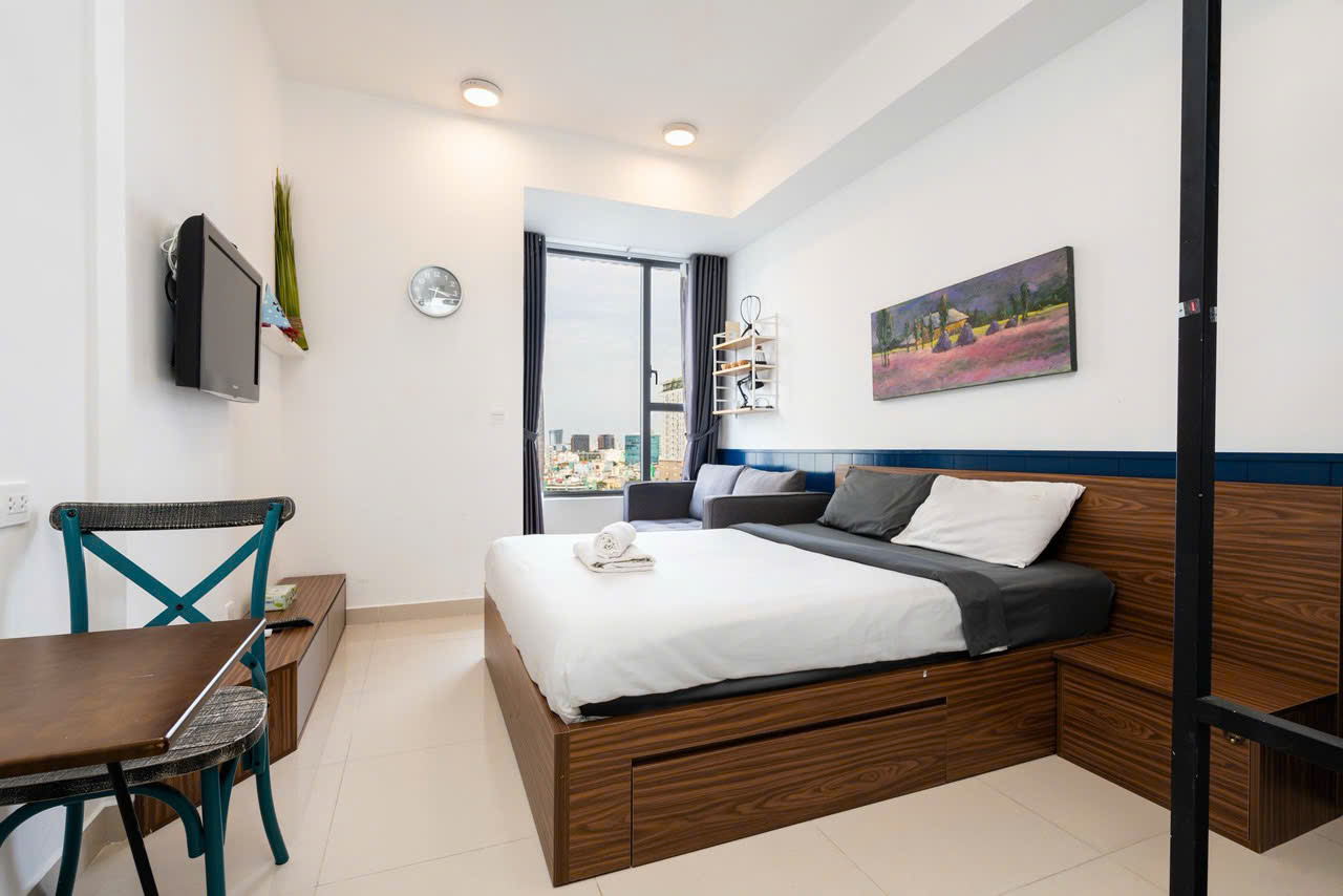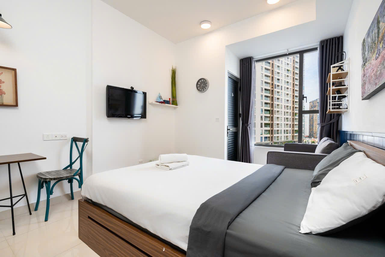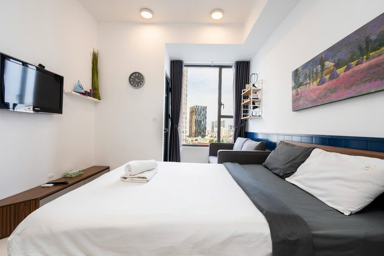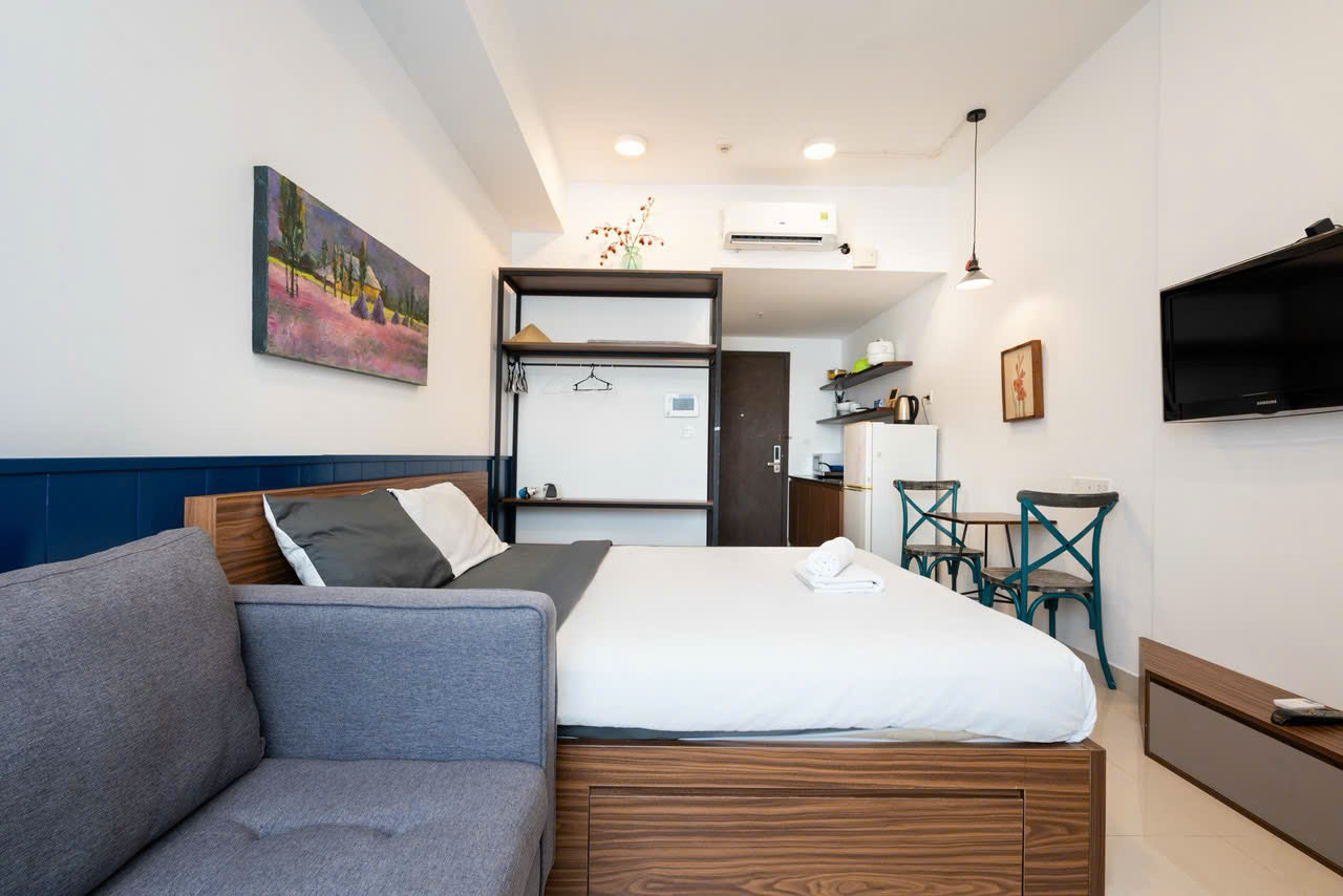 Thiết kế hiện đại ✅: Căn hộ studio (30-40m²), 1 nhà vệ sinh, trang bị nội thất cao cấp: giường queen-size, sofa, bếp từ, TV thông minh 4K, máy giặt, Wi-Fi tốc độ cao, kính Low-E chống nhiệt. Xem thêm căn hộ tại danh sách căn hộ.